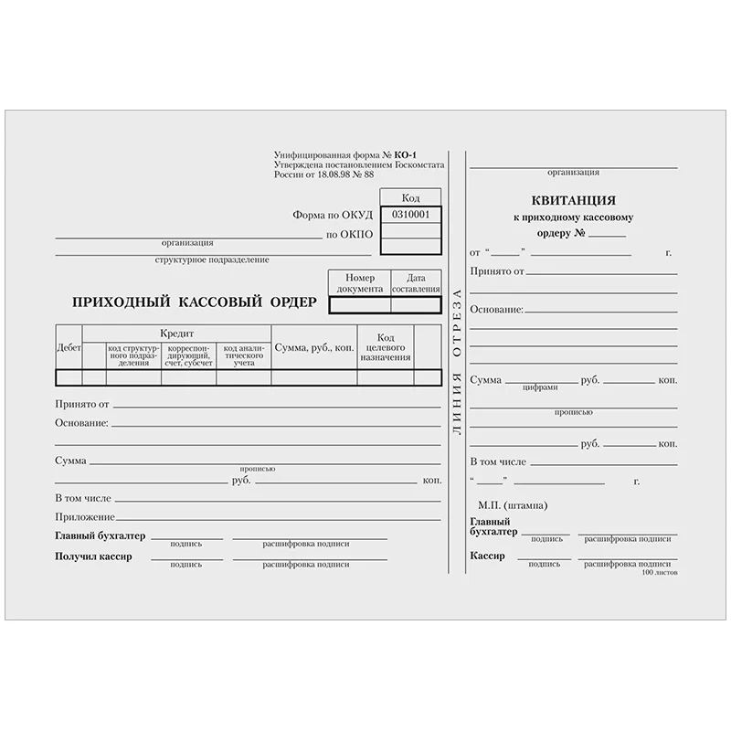 Бланк приходный кассовый ордер А5, 150х210 мм, 100 листов, пустографка