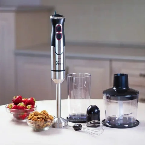 Погружная ножка блендера, насадка-венчик и ножи измельчителя выполнены из качественной и прочной нержавеющей стали. Ножи насадки-блендера способны эффективно измельчить и смешать продукты.