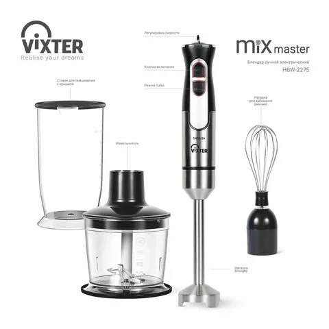 Блендер погружной 3 в 1 VIXTER HBW-2275, 1400 Вт, регулировка скорости, TURBO, 3 насадки, стакан чер