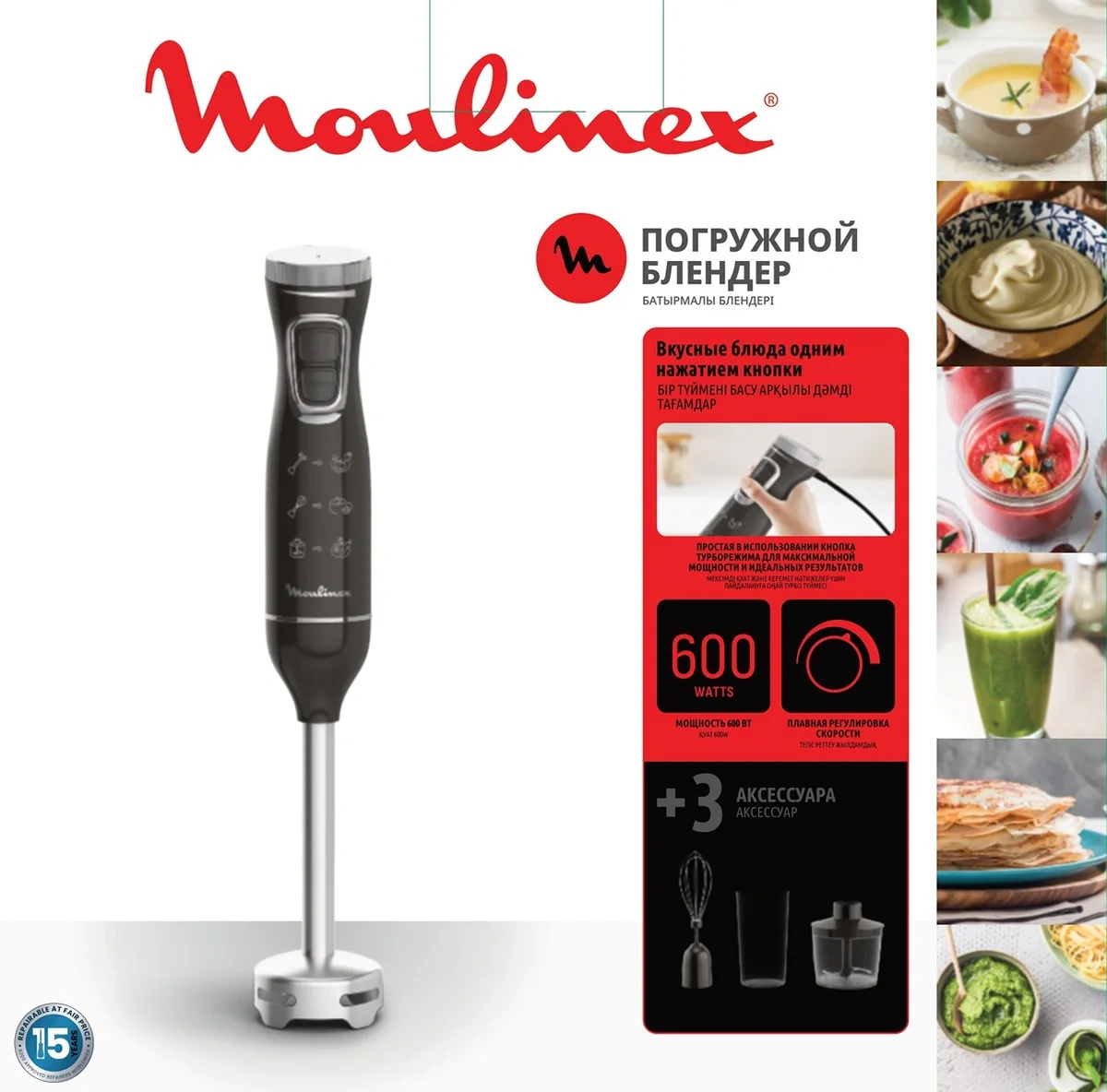 Ваша кухонная станция 3-в-1 для идеальных результатов. Мощность 600 Вт и система Турбо легко справятся с самыми сложными задачами: от нежного супа-пюре до густого смузи и взбитых сливок. Умный регулятор скорости обеспечивает полный контроль над консистенцией. Всё необходимое уже в комплекте: мерный стакан на 700мл для приготовления порций на всю семью, измельчитель на 500мл для соусов и орехов и венчик для воздушных десертов. Откройте новые возможности для кулинарных экспериментов.