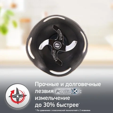 Блендер оснащен технологией лезвий Powelix, благодаря которой даже твердые продукты измельчаются легко и быстро, текстура получается однородной, а лезвия защищены от повреждений.
