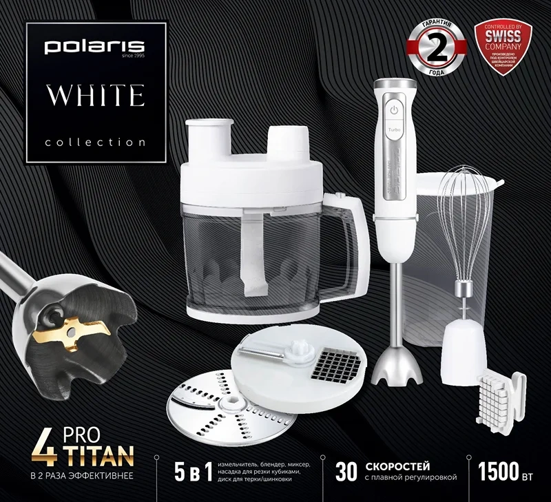 Ножи блендера 4 PRO TITAN с титановым покрытием работают в 2 раза эффективнее и сохраняют прочность и остроту на долгие годы.Технология PROtect+ двойная защита двигателя (от перегрева и перегрузки) обеспечивает надежность и долговечность.Мощность: 1500Вт.5 в 1: измельчитель, блендер, миксер, насадка для резки кубиками, диск для нарезки ломтиками/шинковки.30 скоростей с плавной регулировкой.Скоростной режим Турбо.Насадка блендера из нержавеющей стали.Низкий уровень шума.Венчик для взбивания из нержавеющей стали.Чаша измельчителя объемом 2л.Мерный стакан с крышкой 0,6л.Насадка для резки кубиками.Диск для нарезки ломтиками/шинковки.Специальное приспособление для быстрой и легкой очистки.