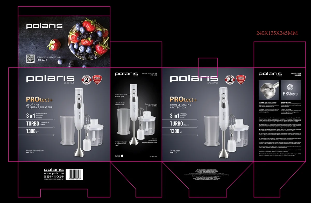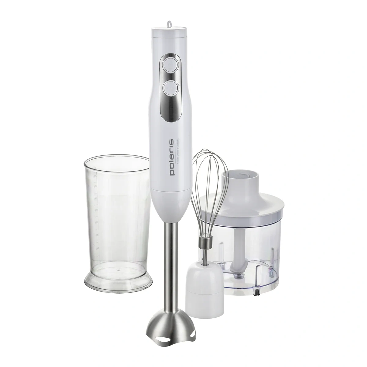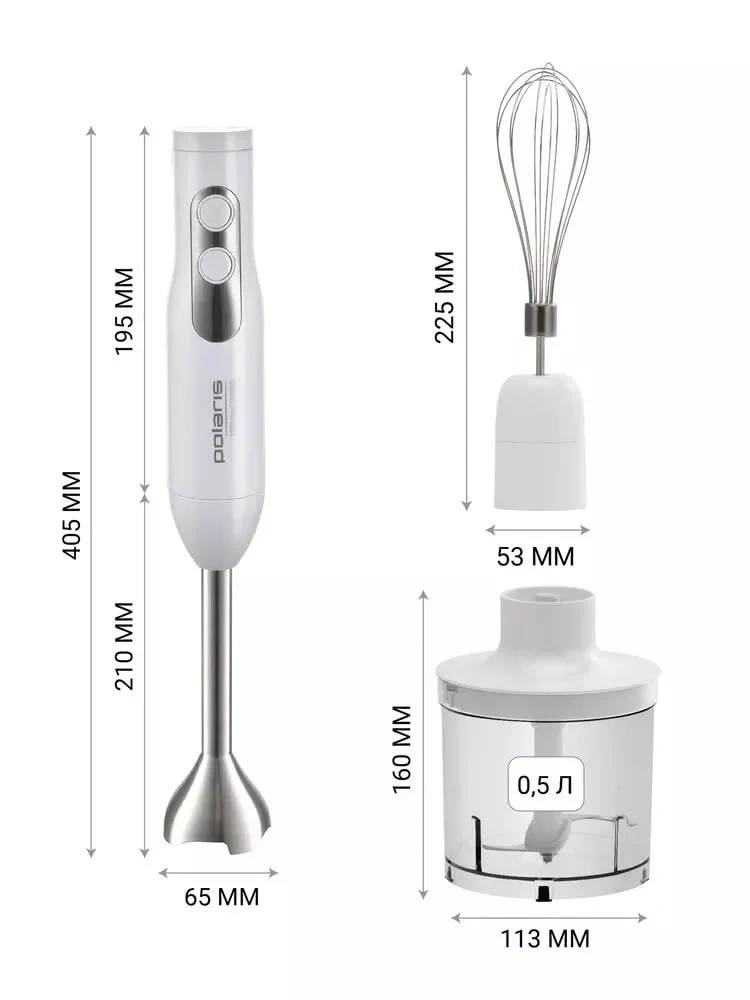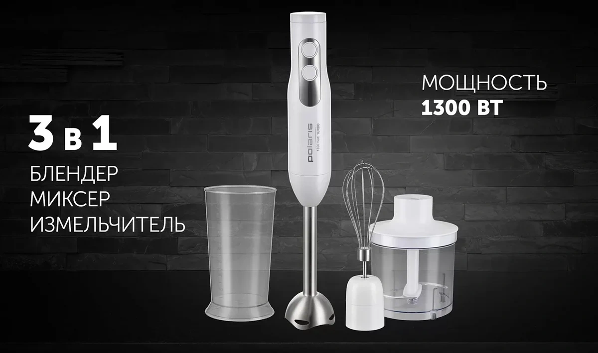Блендер погружной Polaris PHB 1278 – незаменимый прибор, который существенно упрощает процесс приготовления пищи. Блендеры, миксеры и измельчители активно используются на профессиональных кухнях (в кафе, ресторанах, барах и других предприятиях общественного питания). Их преимущества давно оценили домохозяйки. Наличие таких приборов позволяет экономить время и силы. Их использование помогает быстро приготовить вкусное блюдо, десерт или крем. В комплектации имеется сам погружной блендер и удобный мерный стакан объемом 700 мл. Градуированная шкала на нем позволяет точно отмерить нужное количество продуктов. Его высокие стенки предотвращают разбрызгивание жидкостей в процессе приготовления. Есть венчик, с помощью которого готовят муссы и коктейли. Измельчитель объемом 500 мл позволяет быстро и без усилий измельчить продукты до нужной консистенции (в том числе до однородной). Для быстрой работы имеется турборежим, который включается с помощью кнопки, расположенной на корпусе. Погружной блендер рассчитан на длительную эксплуатацию. Производитель предусмотрел защиту от перегрева и перегрузок. Корпус эргономичной формы удобно лежит в руке, не скользит и не вызывает напряжения мышц даже при долгой работе. У него имеется защита от поражения током. Металлические части насадок изготовлены из нержавеющей стали. Этот материал прочный и надежный. Все детали, соприкасающиеся с продуктами, не окисляются и не выделяют токсичных или опасных для человека веществ.