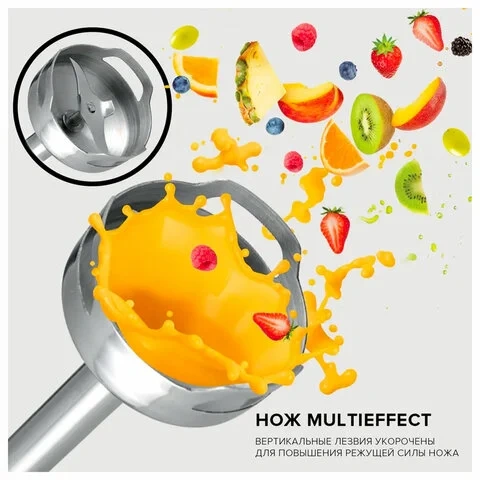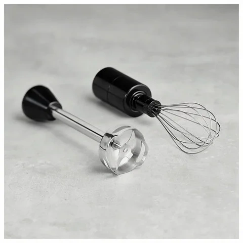 В комплекте к блендеру прилагаются насадка для измельчения и смешивания, мини-измельчитель, объем которого составляет 0,35 л, металлический венчик для взбивания, мерный стакан объемом 0,6 л и насадка для приготовления пюре.