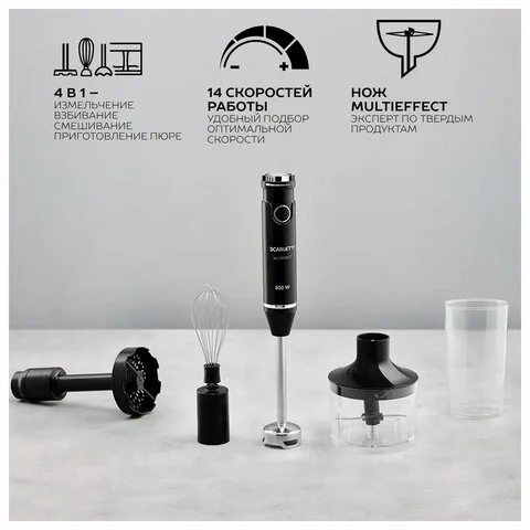 Блендер погружной SCARLETT SC-HB42M49, 800Вт, 14 скоростей, 4 насадки, стакан, черный