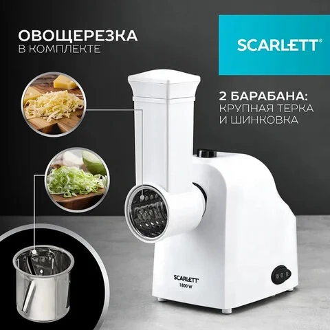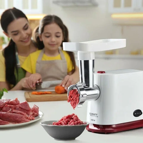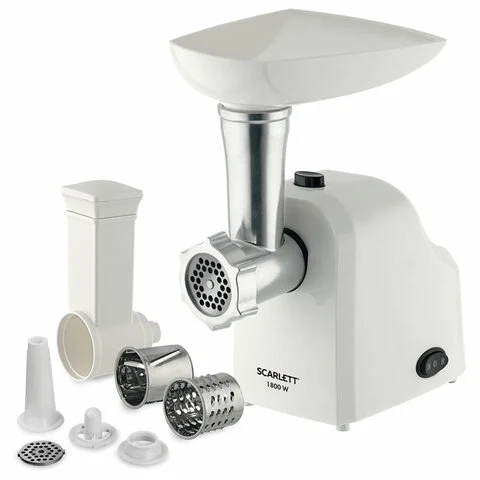 Мясорубка SCARLETT SC-MG45M23, 1800 Вт, производительность 2 кг/мин, 4 насадки, реверс, пластик, бел