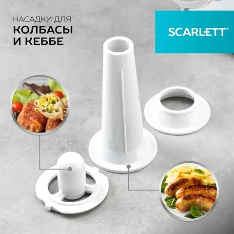 Мясорубка SCARLETT SC-MG45M20, 1800 Вт, производительность 2 кг/мин, 4 насадки, реверс, пластик, бел