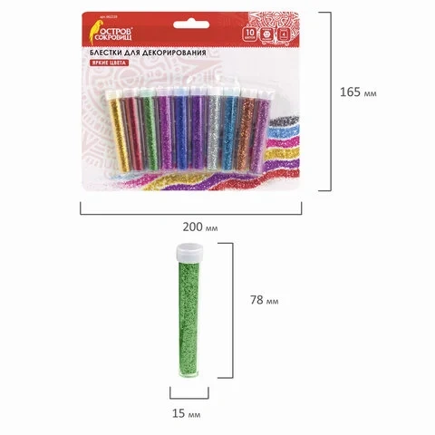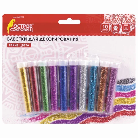 Блестки для декора (глиттер) ОСТРОВ СОКРОВИЩ, НАБОР 10 цветов по 4 грамма, блистер, 662229