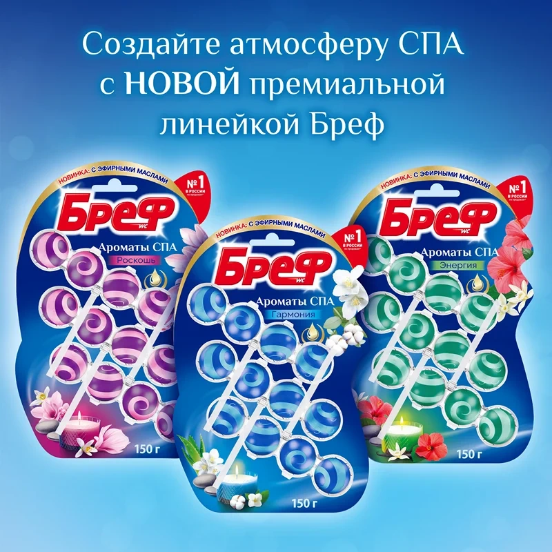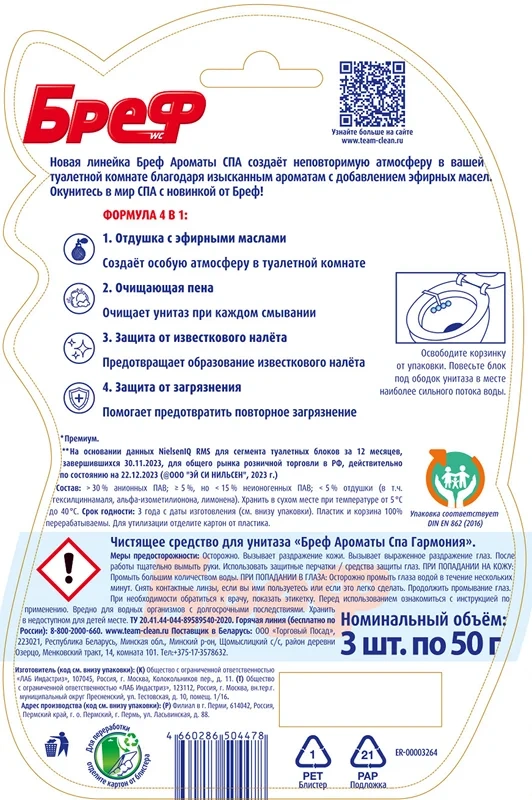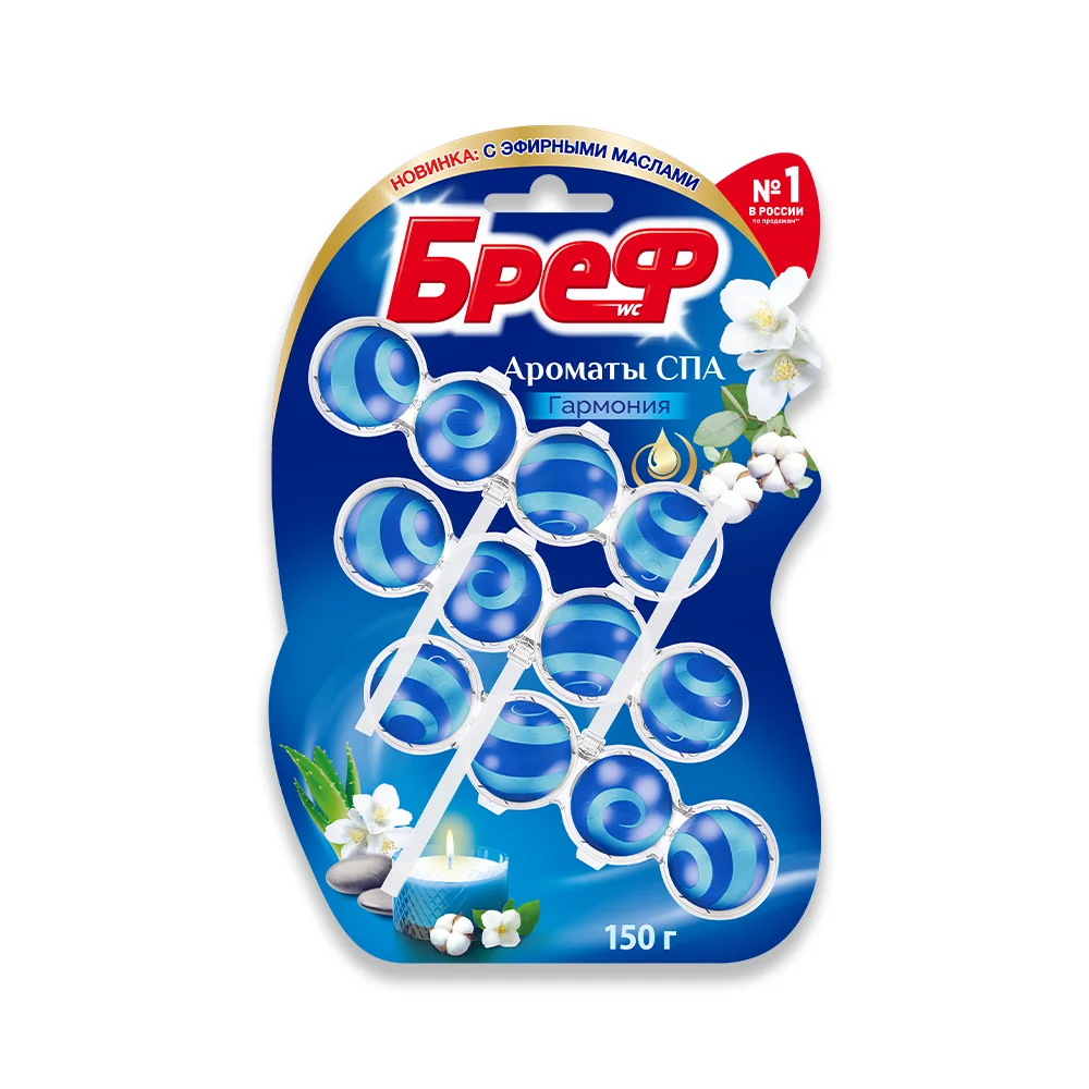 Блок для унитаза Бреф Ароматы Спа Гармония, 50г x 3шт - новая линейка Бреф Ароматы создаёт неповторимую атмосферу в вашей туалетной комнате благодаря изысканным ароматам с добавлением эфирных масел. Туалетный блок Бреф Ароматы СПА действует в 4 направлениях: образует очищающую пену, которая обеспечивает гигиеническую чистоту, предотвращает образование известкового налета, помогает предотвратить повторное загрязнение, придает туалетной комнате изысканный аромат после каждого смывания.