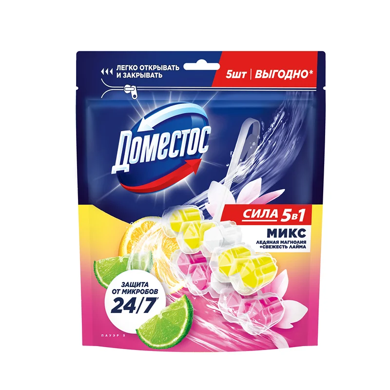 Блок для очищения туалета Доместос Power 5 Свежесть лайма или Ледяная магнолия против известкового налета и неприятного запаха — это пять преимуществ, помогающих обеспечить защиту от загрязнений и микробов и сохранить чистоту и блеск. При каждом смывании появляется свежий аромат магнолии на срок до 4 часов и обильная пена, которая борется с налетом, поддерживая гигиену и блеск поверхности унитаза. Блок для очищения унитаза Доместос содержит активное средство, которое под действием напора воды ополаскивает всю поверхность унитаза, защищая от бактерий и помогая предотвращать известковый налет.
