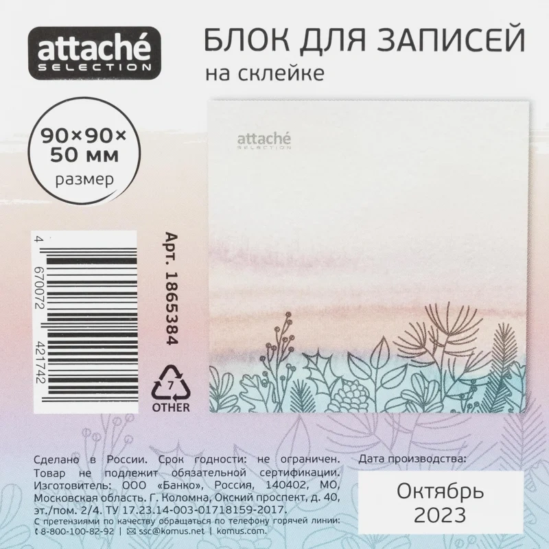 Блок для записей Attache Selection 90x90x50 Акварельная флора, бежевый 100г Блок бумаги для заметок с оригинальным рисунком удобен для оперативной записи информации в офисе или дома. Применение таких блоков очень распространено: для заметок, для заголовков и записи важных дел или планов, замечаний и исправлений. Размер блока: 90х90х50 мм. Индивидуальная упаковка в термоусадочную пленку.Законодательные и технические документы:
