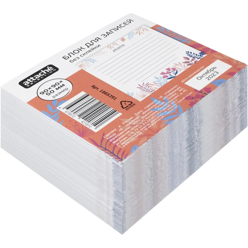 Блок для записей Attache Selection 90x90x50 Флора, разноцветный 100г Блок бумаги для заметок с оригинальным рисунком удобен для оперативной записи информации в офисе или дома. Применение таких блоков очень распространено: для заметок, для заголовков и записи важных дел или планов, замечаний и исправлений. Размер блока: 90х90х50 мм. Индивидуальная упаковка в термоусадочную пленку.Законодательные и технические документы:
