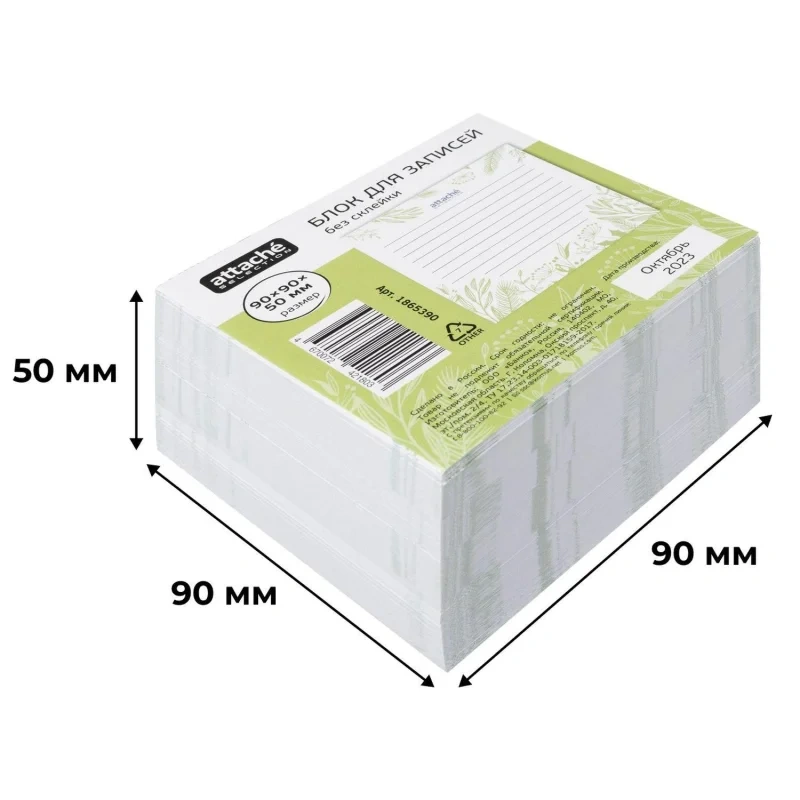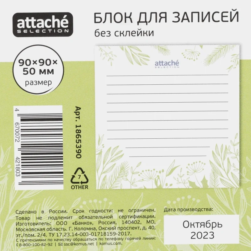 Блок для записей Attache Selection 90x90x50 Флора, зеленый 100г Блок бумаги для заметок с оригинальным рисунком удобен для оперативной записи информации в офисе или дома. Применение таких блоков очень распространено: для заметок, для заголовков и записи важных дел или планов, замечаний и исправлений. Размер блока: 90х90х50 мм. Индивидуальная упаковка в термоусадочную пленку.Законодательные и технические документы: