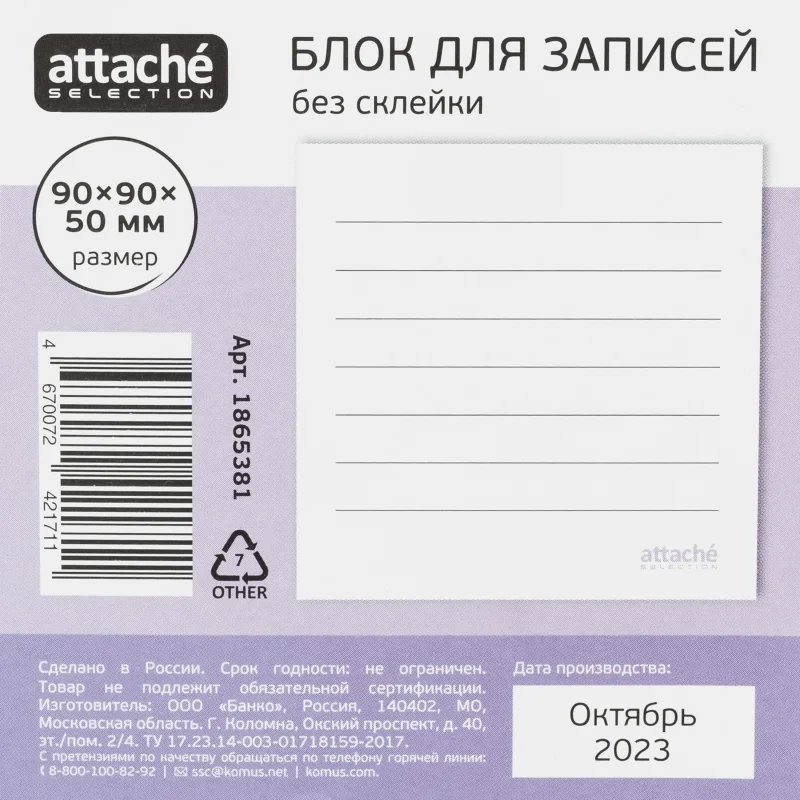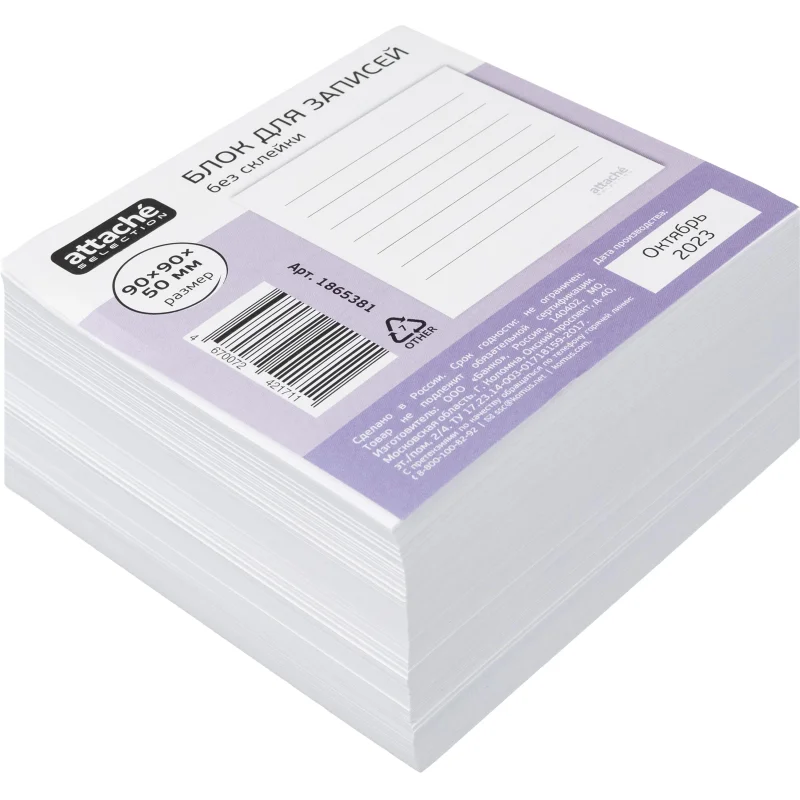 Блок для записей Attache Selection 90x90x50 Не забыть, белый 100г Блок бумаги для заметок 'Не забыть' удобен для оперативной записи информации в офисе или дома. Применение таких блоков очень распространено: для заметок, для заголовков и записи важных дел или планов, замечаний и исправлений. Размер блока: 90x90x50 мм. Индивидуальная упаковка в термоусадочную пленку.Законодательные и технические документы: