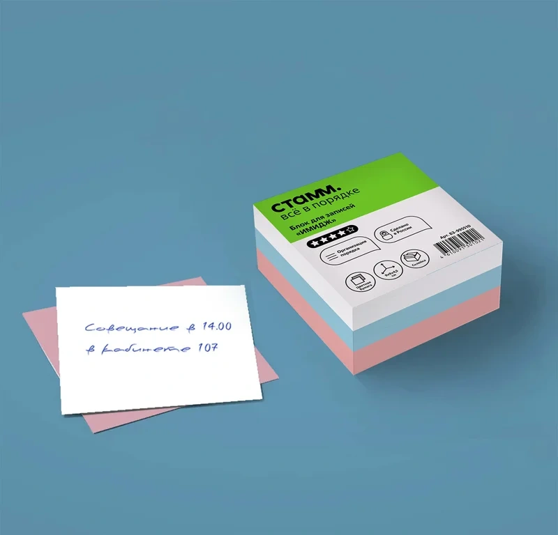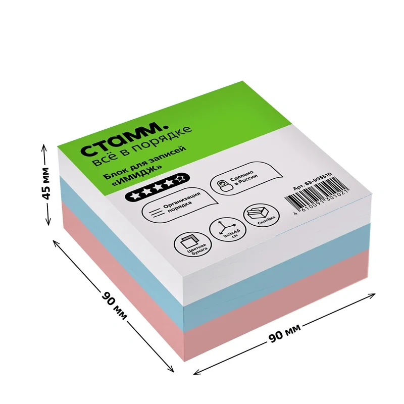 Блок бумаги на склейке «СТАММ» Имидж подходит для оперативных записей необходимой информации. Размер листа в блоке: 90*90 мм, высота блока – 45 мм. Блок для записей представлен в индивидуальной упаковке в термоусадочной плёнке.