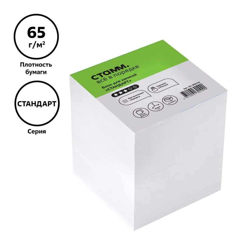 Блок бумаги на склейке «СТАММ» Стандарт подходит для оперативных записей необходимой информации. Размер листа в блоке: 90*90 мм, высота блока – 90 мм. Цвет бумаги блока - белый со стандартом белизны 90-92%. Блок для записей проклеен по одному краю. Представлен в индивидуальной упаковке в термоусадочной плёнке.