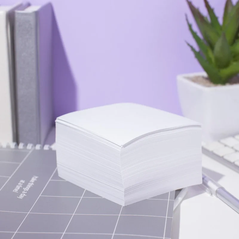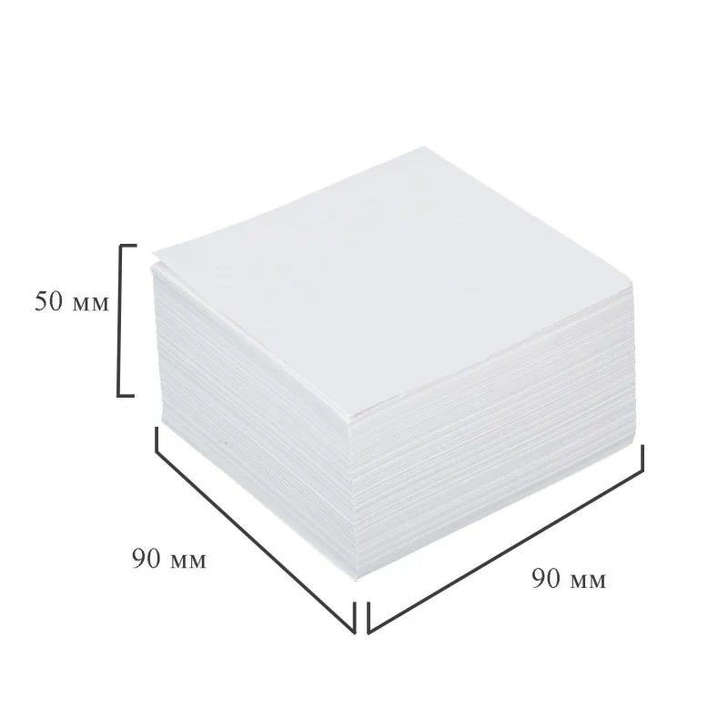 Блок высотой 5 см сложен из квадратных листов размером 9×9 см. Листы не склеены между собой. Листы изготовлены из высококачественной белой офсетной бумаги плотностью 80 г/кв.м и белизной 92%. Блок для записей подходит для письма любыми типами ручек и карандашей. Благодаря высокой плотности листы не продавливаются при нажатии. Поставляется в термоусадочной пленке, защищающей блок при транспортировке. Для повышения удобства рекомендуется использование в пластиковых подставках и настольных органайзерах.