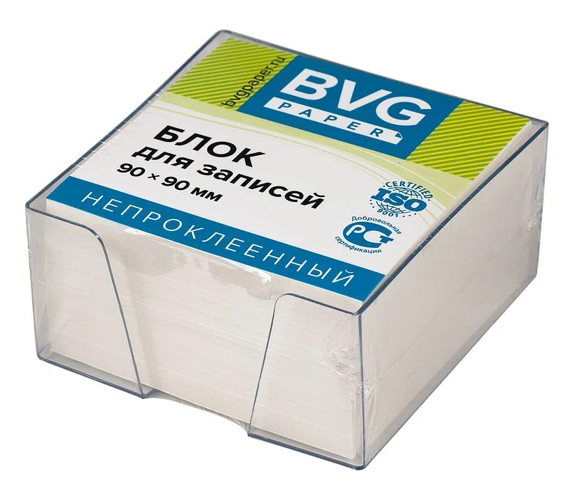 Блок белый эконом в боксе Размеры 9*9*4,5, в боксе. Бумага белая эконом класса, сертифицирована по Ростест и ISO. Плотность 60-62 г/м Белизна 92–95% Блоки для записей надежно упакованы в импортную термоусадочную пленку вместе с боксом.