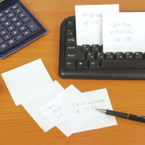 Блок высотой 8 см сложен из квадратных листов размером 8х8 см. Листы изготовлены из высококачественной офсетной бумаги плотностью 65 г/м2 и белизной 90-92%. Блок для записей подходит для письма любыми типами ручек и карандашей. Поставляется в плотной термоусадочной пленке, защищающей при транспортировке.