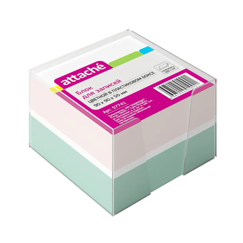 Блок для записей в боксе Attache предназначен для работы в офисе или дома. Будет полезен в использовании для рабочих процессов и повседневных задач, а также при проведении совещаний, обучений, мозговых штурмов. Идеально подходит для работников офиса . Блок высотой 5 см сложен из квадратных листов размером 9×9 см и вложен в прозрачный пластиковый бокс. Листы не склеены между собой. Листы изготовлены из высококачественной офсетной бумаги плотностью 80-100 г/кв.м. В боксе представлены листы трех цветов: белого, зеленого, розового. Блок для записей подходит для письма любыми типами ручек и карандашей. Благодаря высокой плотности листы не продавливаются при нажатии. Поставляется в термоусадочной пленке, защищающей блок при транспортировке.