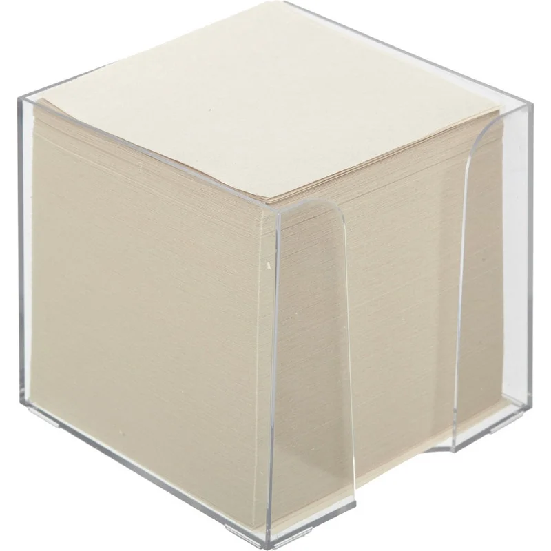 Блок для записей размером 9×9×9 см выполнен из бумаги экономкласса. Прозрачный пластиковый бокс, в который вложен блок, обеспечивает удобство использования и порядок на столе. Поставляется упакованным в термоусадочную пленку. Относится к суперэконом — сегменту. Оптимальное соотношение цены и качества для тех, кто хочет сэкономить.