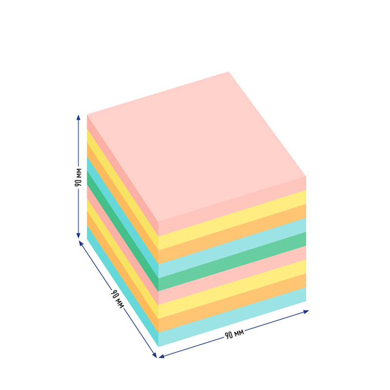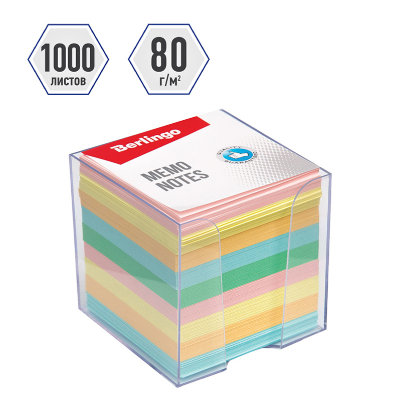 Блок для оперативных записей. В удобном пластиковом боксе. 1000 листов, цветной. Размер листа в блоке - 90 ? 90 мм. Бумага плотностью 80 г/м?. Индивидуальная упаковка в термоусадочную пленку.