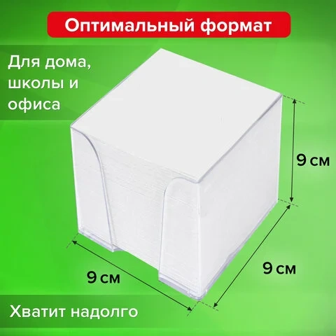 Блок высотой 9 см сложен из квадратных листов размером 9 х 9 см. Листы изготовлены из высококачественной офсетной бумаги плотностью 60 г/м2 и белизной 90-92%. Блок для записей подходит для письма любыми типами ручек и карандашей, листы благодаря высокой плотности не продавливаются при нажатии. Поставляется в плотной термоусадочной пленке, защищающей при транспортировке. Когда бумага закончится, можно вставить сменный блок.