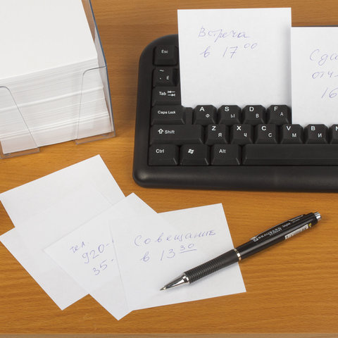 Блок высотой 9 см сложен из квадратных листов размером 9 х 9 см. Листы изготовлены из высококачественной офсетной бумаги плотностью 80 г/м2 и белизной 95-98%. Блок для записей подходит для письма любыми типами ручек и карандашей, листы благодаря высокой плотности не продавливаются при нажатии. Поставляется в плотной термоусадочной пленке, защищающей при транспортировке. Когда бумага закончится, можно вставить сменный блок.