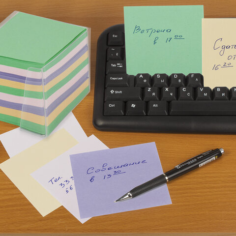 Блок высотой 9 см сложен из квадратных листов разной расцветки размером 9 х 9 см. Листы изготовлены из высококачественной офсетной бумаги плотностью 80 г/м2. Блок для записей подходит для письма любыми типами ручек и карандашей, листы благодаря высокой плотности не продавливаются при нажатии. Поставляется в плотной термоусадочной пленке, защищающей при транспортировке. Когда бумага закончится, можно вставить сменный блок.