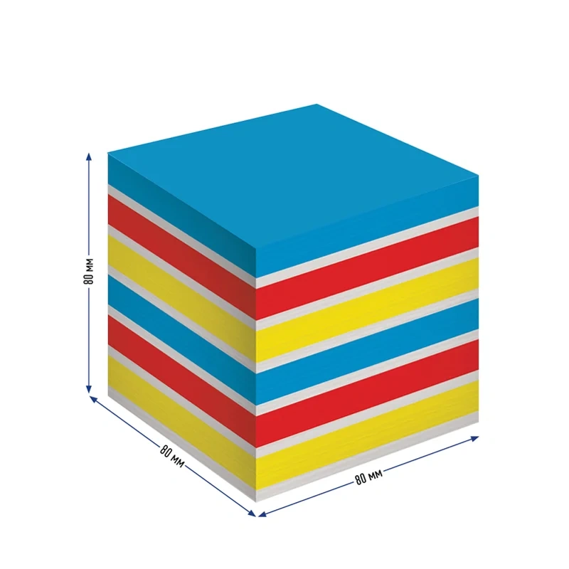 Сочетание трёх насыщенных цветов (красного, жёлтого, синего) и белого цвета бумаги для записи отлично украсит рабочий стол. Блок для записей проклеен по одному краю. Представлен в индивидуальной упаковке в термосадочную плёнку.