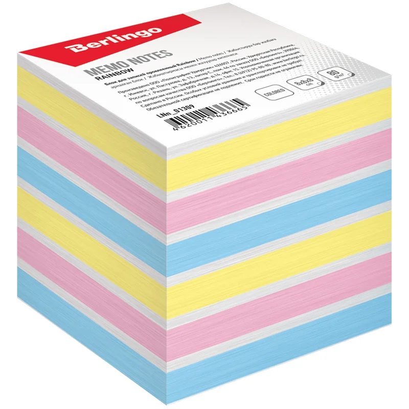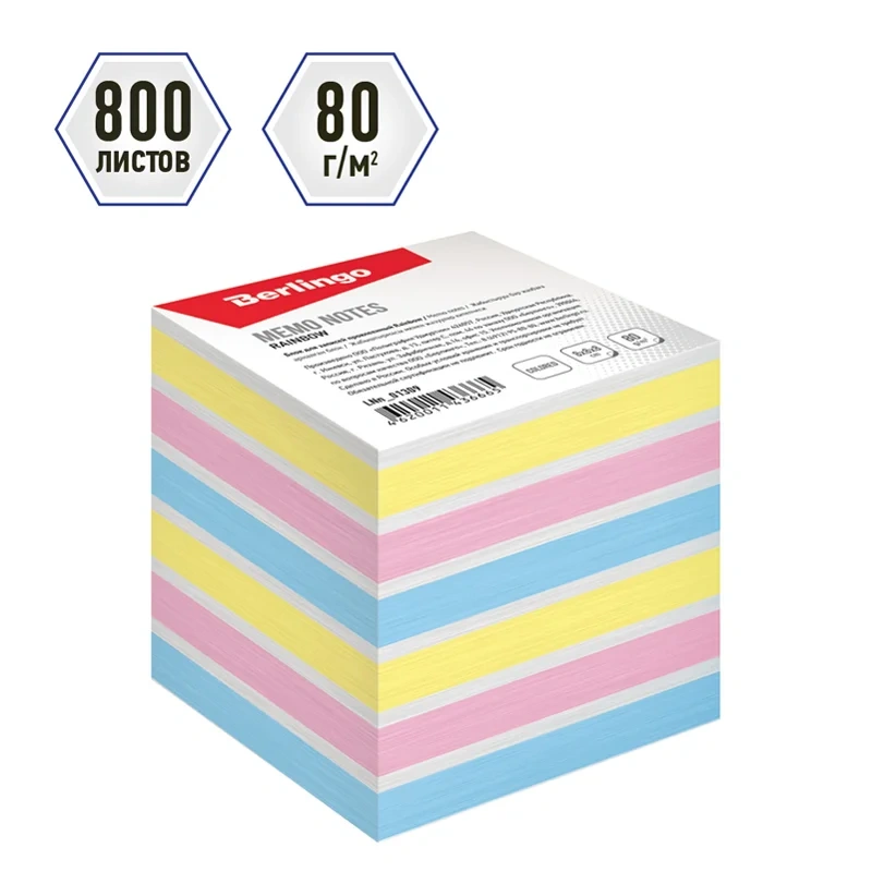 Блок бумаги на склейке Berlingo Rainbow для оперативных записей поможет сохранить важную информацию и интересные идеи. Плотность бумаги для заметок составляет 80 г/м2. Размер листа в блоке для заметок – 80 ? 05 мм. В квадратном блоке 800 листов.