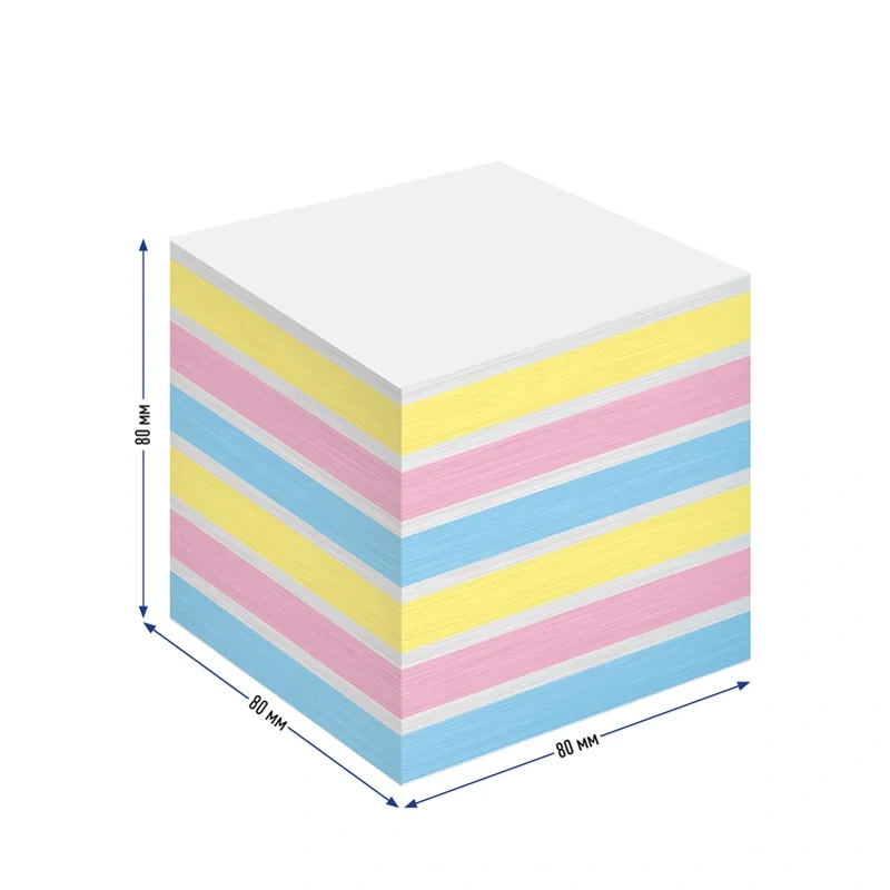 Сочетание трёх пастельных цветов (розового, жёлтого, голубого) и белого цвета бумаги для записи отлично украсит рабочий стол. Блок для записей проклеен по одному краю. Представлен в индивидуальной упаковке в термосадочную плёнку.