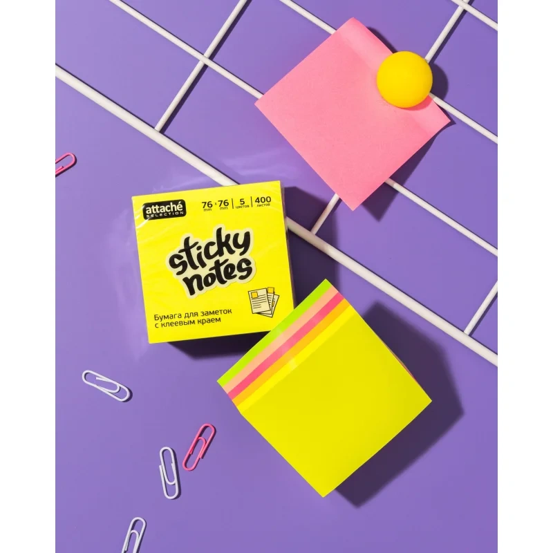 Стикеры Attache Selection Радуга в формате 76×76 мм, состоят из 80 листов каждого цвета (всего 400 листов). Стикеры из 5 неоновых цветов (желтый, розовый, зеленый, оранжевый, светло-розовый ). Плотность бумаги: 75 г/кв.м. Клейкий слой — 22 Н/м . Идеально подойдут для сотрудников творческих профессий и руководителей: рекомендуются для использования в процессе совещаний, обучения, мозговых штурмов. Длина клейкой стороны 76 мм.