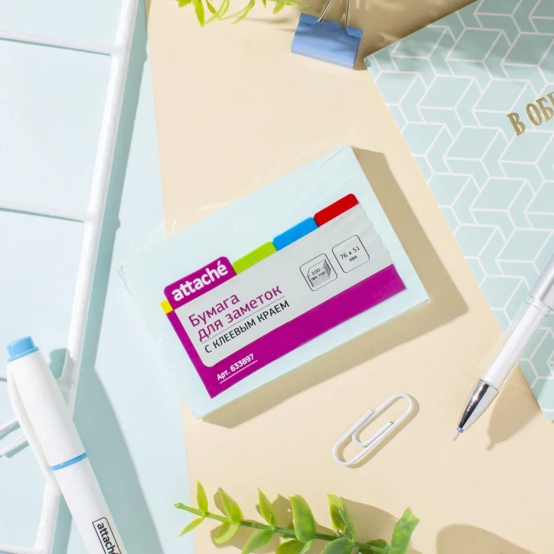 Стикеры Attache в формате 76×51 мм, голубого цвета, состоят из 100 листов. Идеально подойдут для сотрудников творческих профессий и руководителей: рекомендуется для использования в процессе совещаний, обучения, мозговых штурмов. Тон стикеров — пастельный. Плотность бумаги составляет 62 г/кв.м, клейкий слой — 22 Н/м . После удаления стикера на поверхности не остается следов клеевого состава, лист можно крепить повторно. Длина клейкой стороны составляет 51 мм.