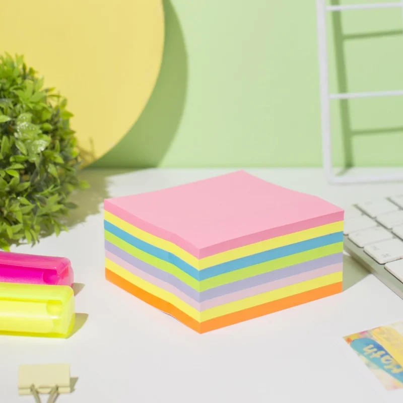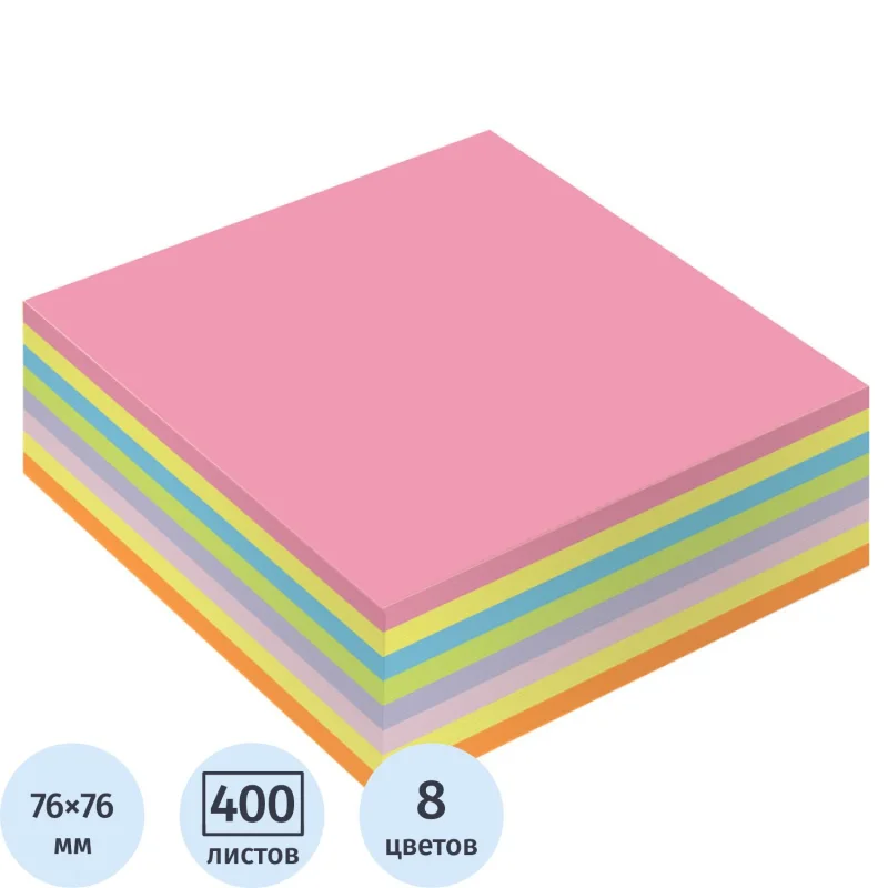 Стикеры Attache Simple куб в формате 76×76 мм, состоят из 400 листов, упакованных в пленку. Стикеры имеют 8 слоев из 8 неоновых цветов (розовый, желтый, голубой, зеленый, фиолетовый, светло-розовый, желтый, оранжевый). Плотность бумаги: 70 г/кв.м. Клейкий слой — 15 Н/м. Хорошо подойдут для сотрудников творческих профессий и руководителей: рекомендуются для использования в процессе совещаний, обучения, мозговых штурмов. Длина клейкой стороны 76 мм. Особых условий хранения не требует, сертификации не подлежит, срок годности не ограничен.