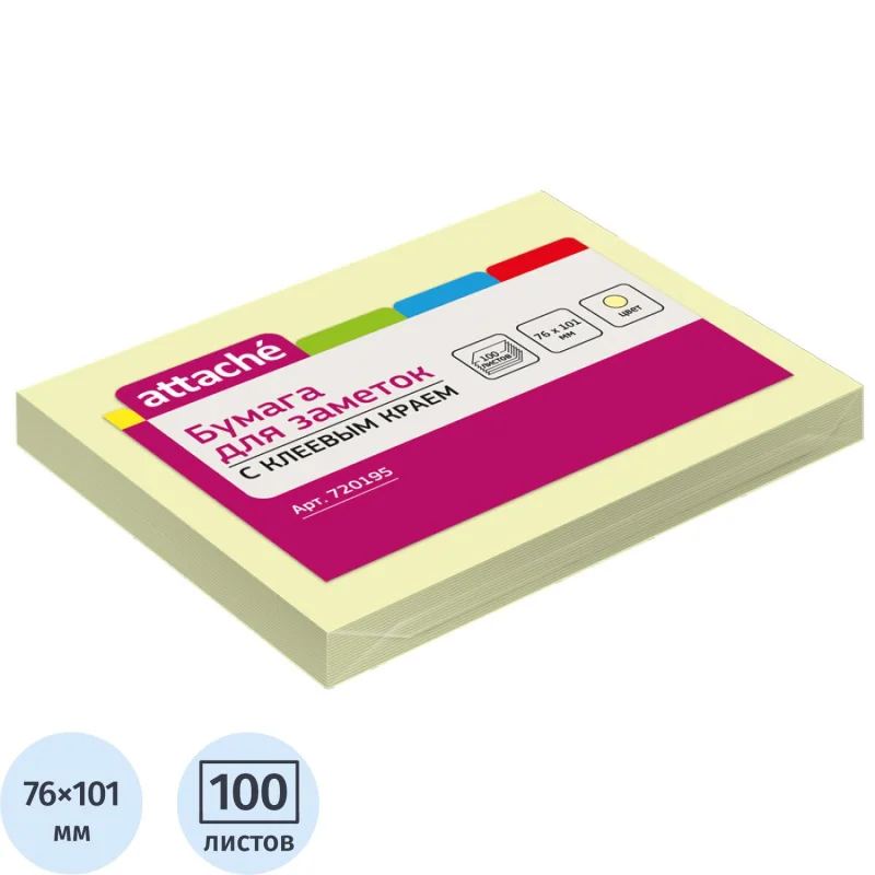 Стикеры Attache в формате 76×101 мм, желтого цвета, состоят из 100 листов. Идеально подойдут для сотрудников творческих профессий и руководителей: рекомендуется для использования в процессе совещаний, обучения, мозговых штурмов. Тон стикеров — пастельный. Плотность бумаги составляет 62 г/кв.м, клейкий слой — 22 Н/м . После удаления бумаги на поверхности не остается следов клеевого состава, лист можно крепить повторно. Длина клейкой стороны 101 мм.