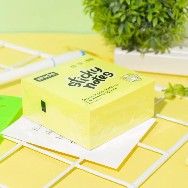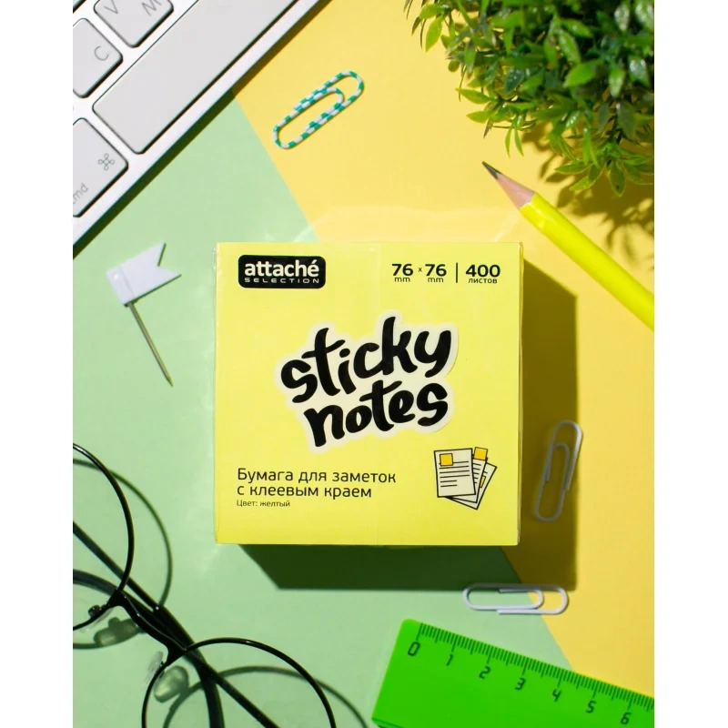 Стикеры Attache Selection в формате 76×76 мм, желтого цвета, состоят из 400 листов упакованных в пленку. Тон стикеров — неоновый. Плотность бумаги: 75 г/кв.м. Клейкий слой — 22 Н/м . Идеально подойдут для сотрудников творческих профессий и руководителей: рекомендуются для использования в процессе совещаний, обучения, мозговых штурмов. Длина клейкой стороны 76 мм.