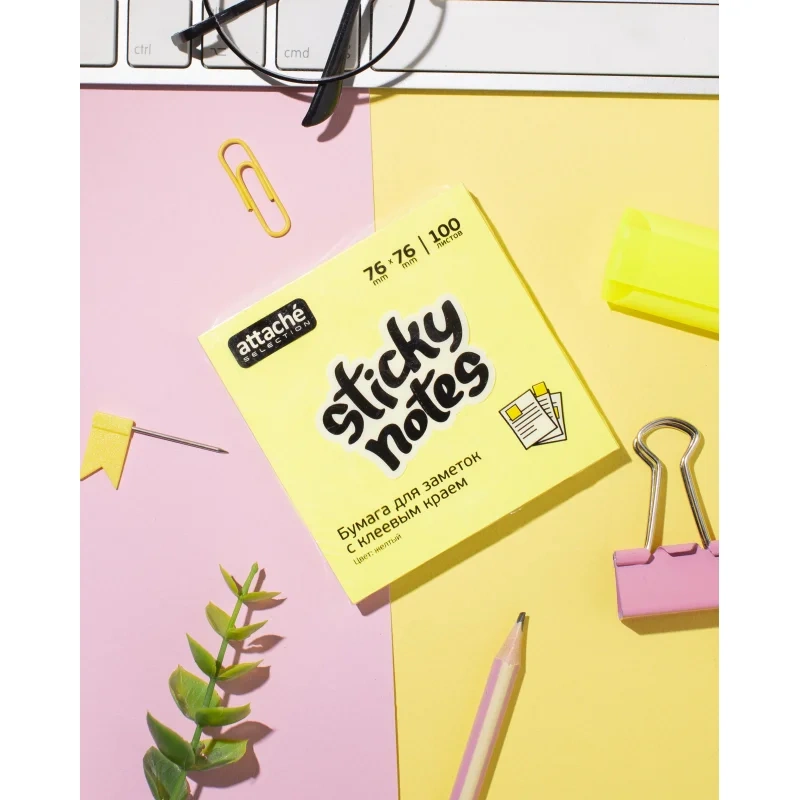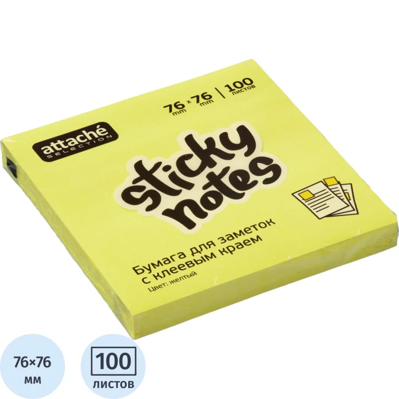 Стикеры Attache Selection в формате 76×76 мм, желтого цвета, 100 листов. Идеально подойдут для сотрудников творческих профессий и руководителей: рекомендуются для использования в процессе совещаний, обучения, мозговых штурмов. Тон стикеров — неоновый. Плотность бумаги: 75–80 г/кв.м. клейкий слой — 22 Н/м . Длина клейкой стороны 76 мм.