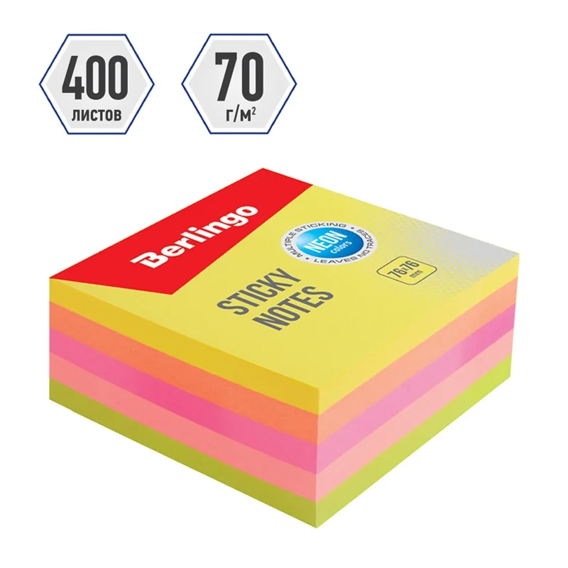 Блок бумаги для записей с клеевым краем Berlingo отлично подойдёт для сохранения важной информации. Плотность бумаги для заметок составляет 75 г/м2. Размер листа в блоке для заметок 76*76 мм. В блоке 400 листов и 5 неоновых цветов. По 80 листов каждого цвета: желтый, зелёный, розовый, коралловый, оранжевый. Блок квадратной формы изготовлен с использованием качественного клеевого состава, который позволяет не оставлять следов на поверхности и многократно использовать лист. Повышенная клейкость – 25 Н/м. В блоке для записей используется специальное покрытие, предотвращающее закручивание, оптимизированное для комфортного письма. Блок для записей упакован в прозрачную пленку с возможностью быстрого открытия.