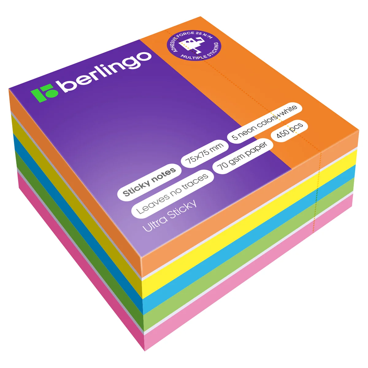 Блок для записей с клейким краем Berlingo Ultra Sticky 5 цветов, неон, 1 белый, 75х75мм, 450 листов