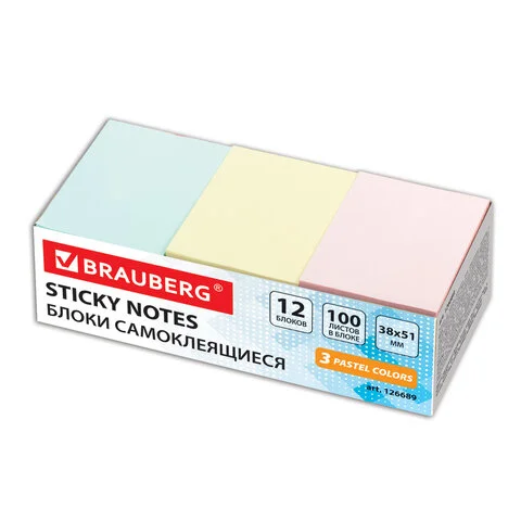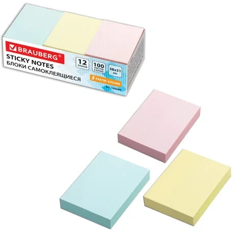 Блок для записей с клейким краем Brauberg 3 цвета, пастельный, 38х51мм, 100 листов, 12шт