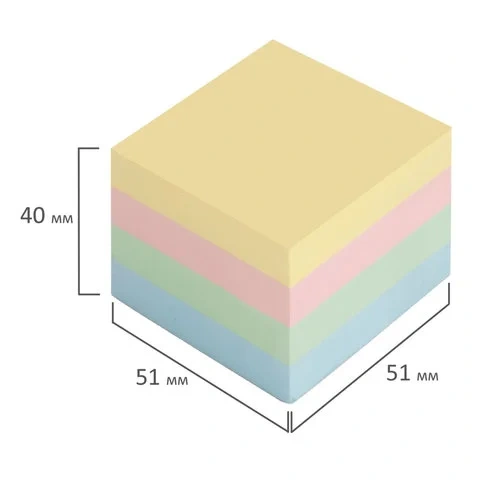 Стикеры 4 пастельных цветов (желтый, розовый, зеленый, голубой) в форме куба 51х51 мм состоят из 400 листов. Плотность бумаги составляет 75 г/м2. Клейкий слой - 35 Н/м. Легко клеятся к любой поверхности. Не оставляют следов. Упакованы в полиэтиленовую пленку.