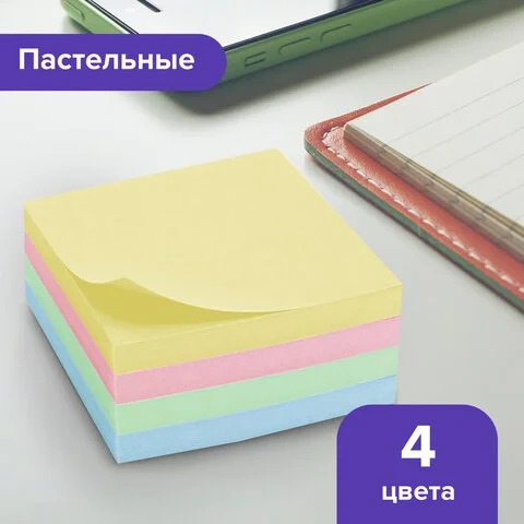 Блок для записей с клейким краем Brauberg 4 цвета, пастельный, 76х76мм, 400 листов
