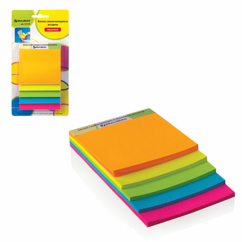 Блок для записей с клейким краем Brauberg 5 цветов, неон, 75х75/ 88/ 100/ 113/ 125мм, 150 листов