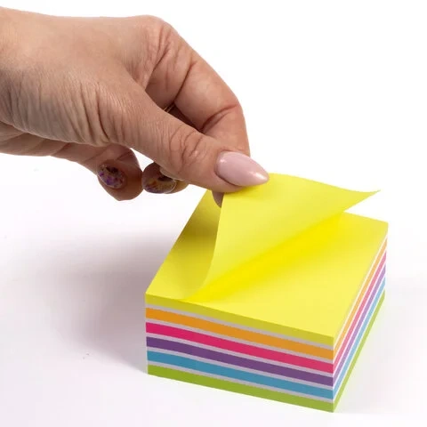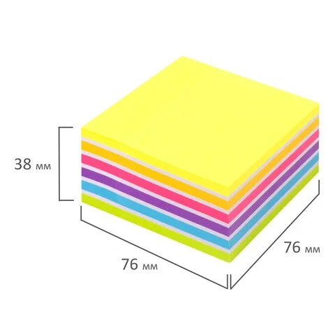 Стикеры 7 неоновых цветов (желтый, оранжевый, розовый, фиолетовый, голубой, зеленый, белый) в форме куба 76х76 мм состоят из 400 листов. Плотность бумаги составляет 75 г/м2. Клейкий слой - 35 Н/м. Легко клеятся к любой поверхности. Не оставляют следов. Упакованы в полиэтиленовую пленку.