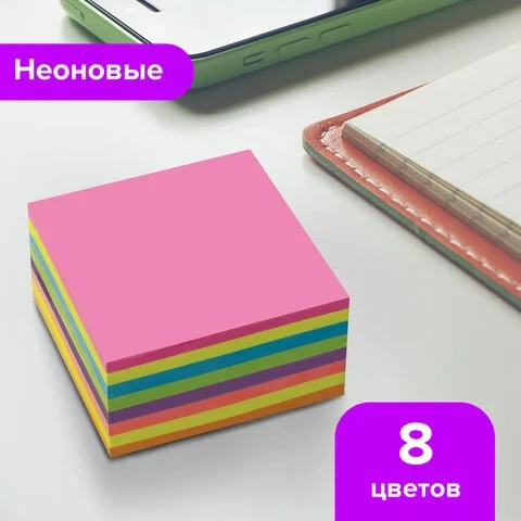 Блок для записей с клейким краем Brauberg 8 цветов, неон, 76х76мм, 400 листов