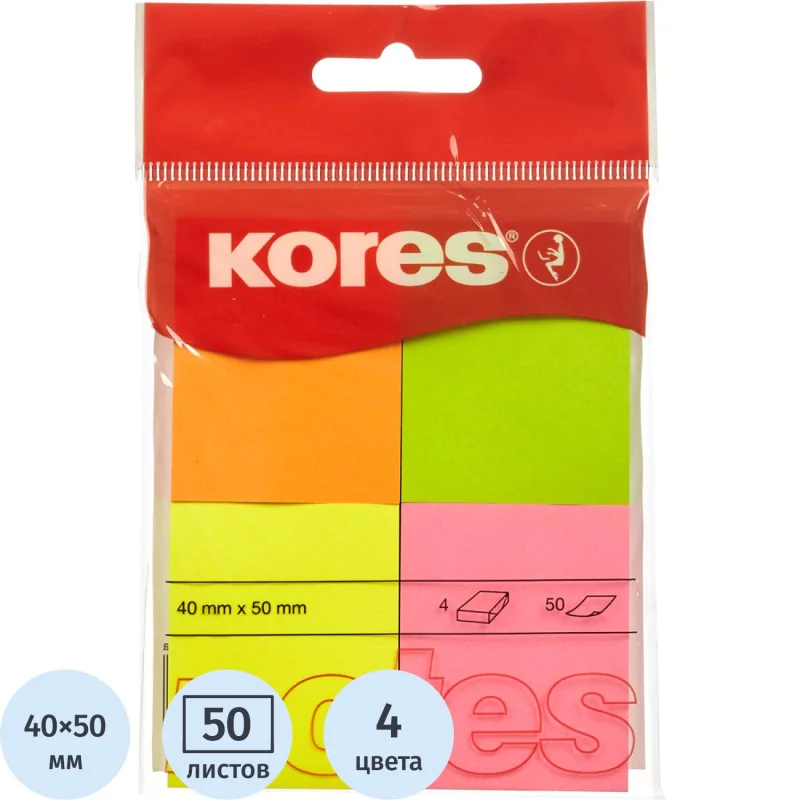 Стикеры Kores идеально подойдут для сотрудников творческих профессий и руководителей: рекомедуются для использования в процессе совещаний, обучения, мозговых штурмов. Размер — 40×50 мм. Тон стикеров: неоновый. 4 цвета (розовый, желтый, оранжевый, салатовый). Плотность бумаги составляет 75 г/кв.м, клейкий слой — 20 Н/м . 4 блока по 50 листов, упаковано в пленку. Длина клейкой стороны составляет 50 мм.