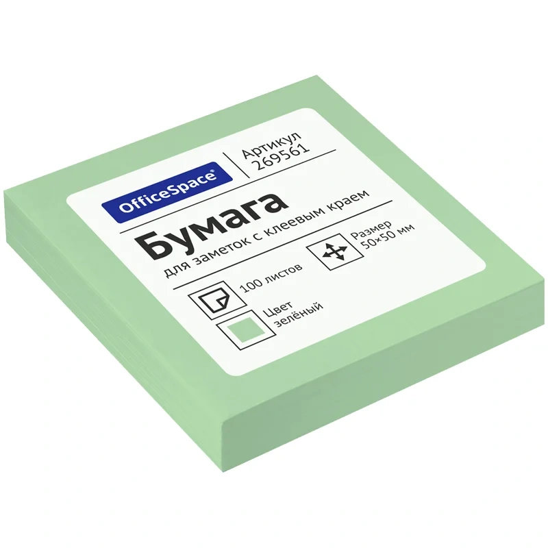 Блок для записей с клейким краем Officespace зеленый, 50х50мм, 100 листов