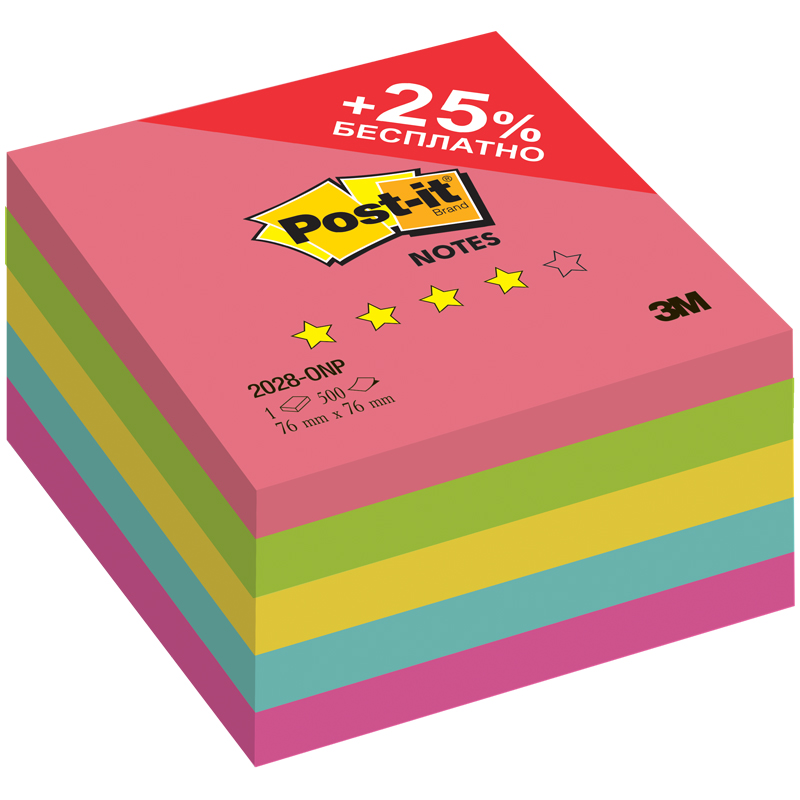 Блок для записей с клейким краем Post-It Optima Лето, 5 цветов неон, 76х76мм, 500 листов, 2028-ONP