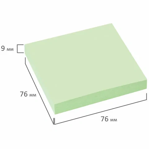 Стикеры зелёного пастельного цвета в форме квадрата 76х76 мм состоят из 100 листов. Плотность бумаги составляет 75 г/м2. Клейкий слой - 22 Н/м. Легко клеятся к любой поверхности. Не оставляют следов. Упакованы в полиэтиленовую пленку.
